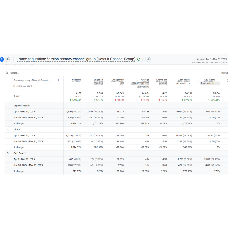 Within months, organic sessions grew from under 800 to 8,000+, with Organic Search contributing over 58% of total traffic. SEO became a key lead driver, generating 150+ form enquiries, nearly 50% directly from organic search. Multiple keywords moved from outside the Top 100 into Top 20, Top 10, and Top 5 positions, including several #1 rankings.